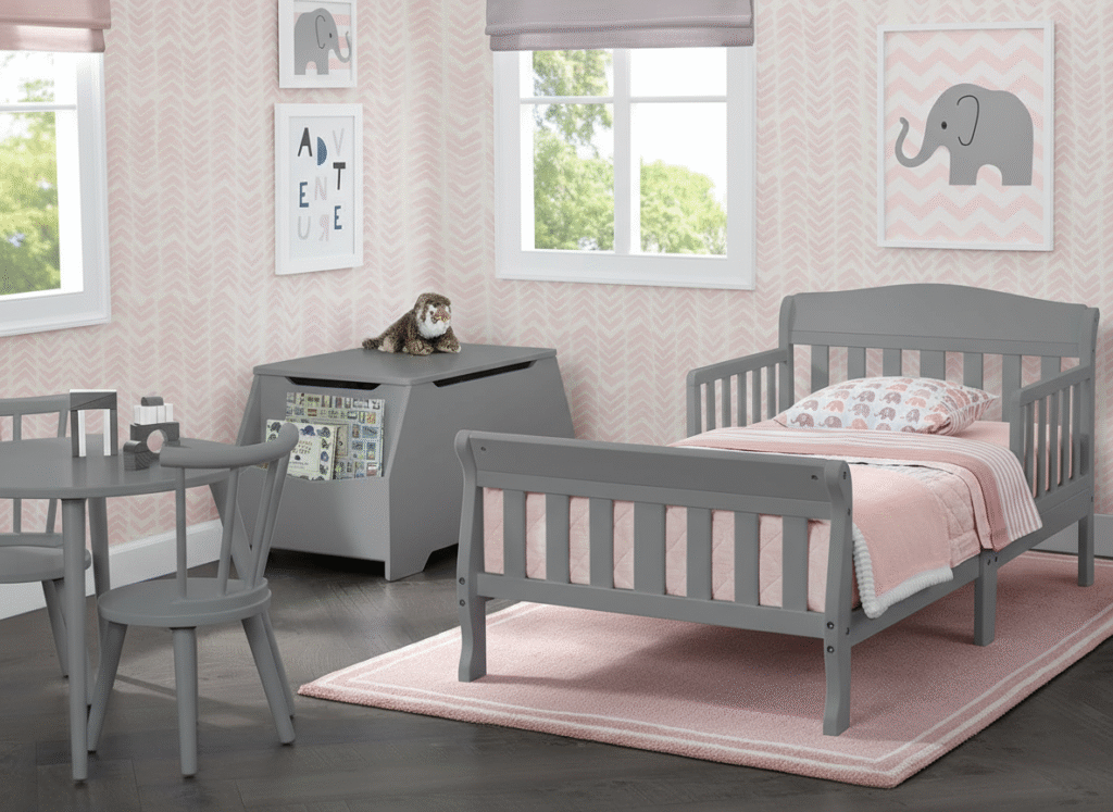 The Delta Children Canton Toddler Bed is a sturdy and stylish grey toddler bed made from strong wood, designed to ensure safety and comfort. It is Greenguard Gold, JPMA, and ASTM certified, ensuring low exposure to chemicals and strict adherence to safety standards. The bed is low to the ground for easy access and fits a full-size crib mattress.