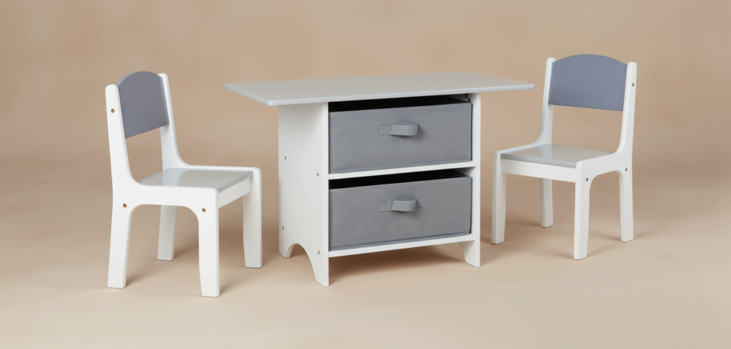 The Milliard Kids Activity Play Table and Chair Set is a sturdy, modern two-tone wood set with white and gray scratch-resistant finish, perfect for a variety of kids’ activities. It includes built-in double storage shelves with slide-out baskets, combining functionality, style, and safety, and it is lab tested for strength and safety.