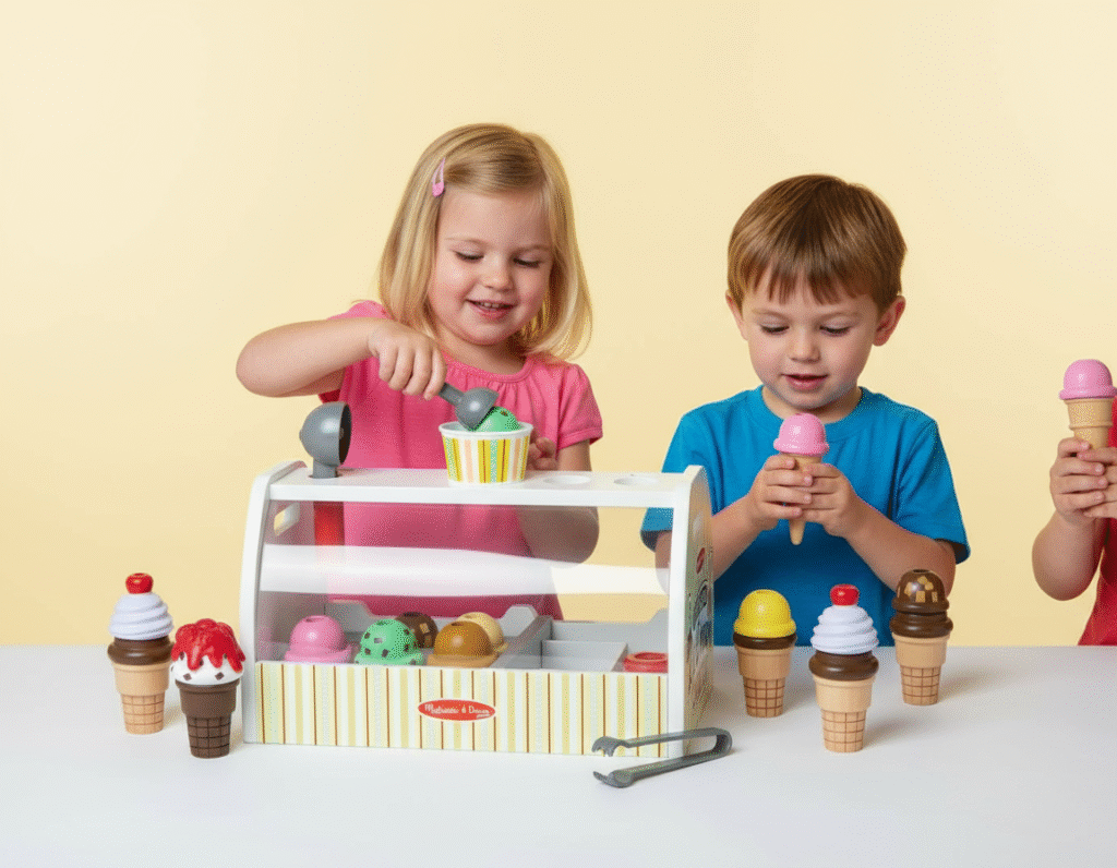 The Melissa & Doug Wooden Scoop & Serve Ice Cream Counter is a comprehensive pretend play set that allows children to mimic real-life ice cream shop experiences. It features bright wooden scoops, toppings, a kid-friendly ice cream scooper, and a sturdy countertop with special ports for all treats. The set helps boost memory, hand-eye coordination, and counting skills through interactive, screen-free play. It also doubles as a storage box for easy cleanup and is ideal as a gift for various occasions.